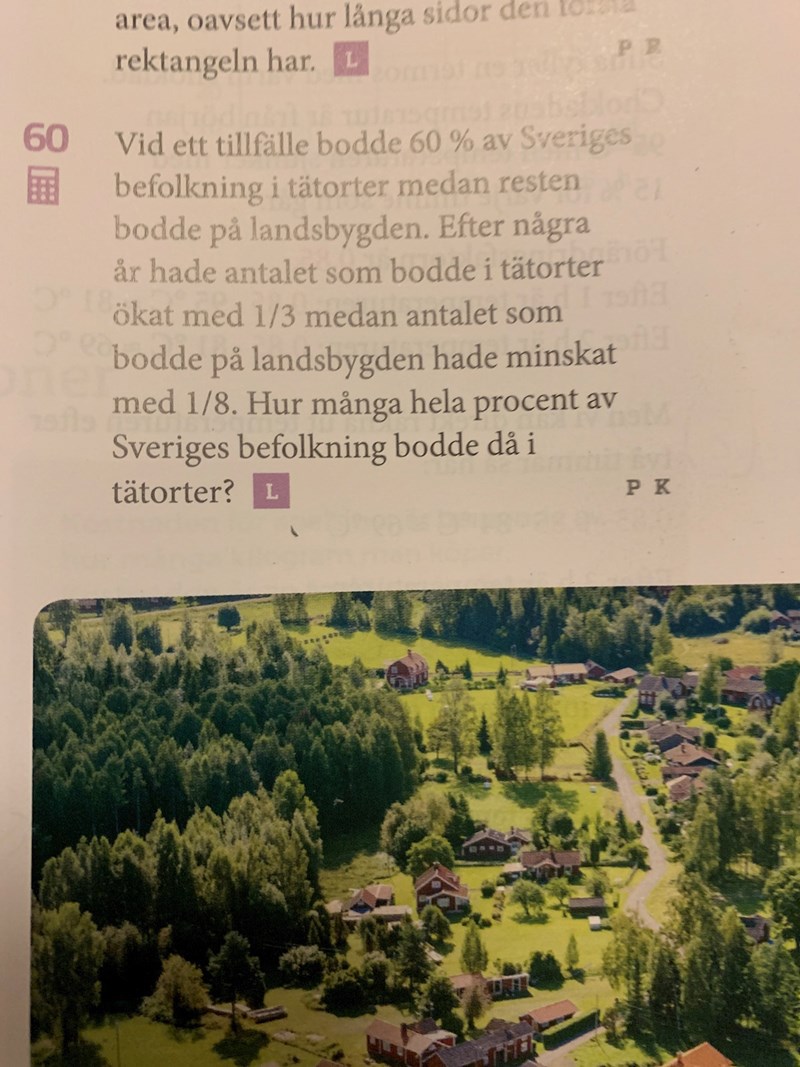 Okej så jag kom fram till att 80% bodde i tätorterna efter ökningen och 35% bodde på landet efter minskningen eftersom att de minskade med en åttondel vilket är 5 (40\8=5) i det här fallet.