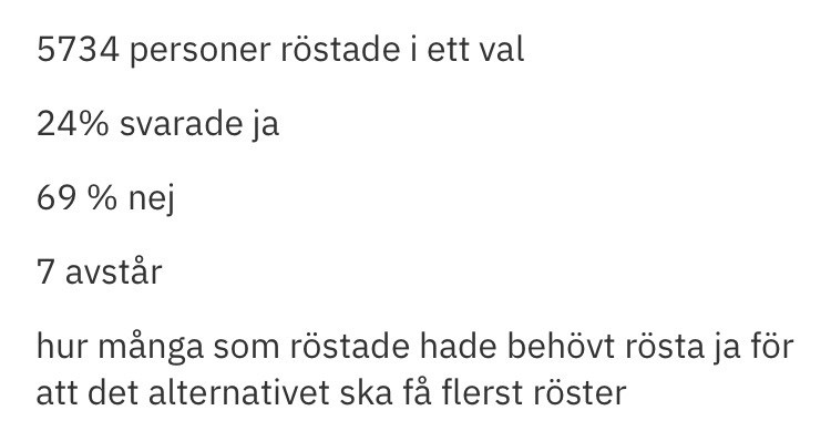 När jag började räkna på hur många personer som röstade ja respektive nej fick jag det till 1376,16 = JA