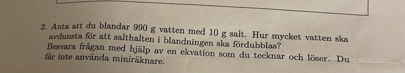 så det vi vill är att x mycket vatten ska avdunsta från 990 g för att ge oss 2% salt.