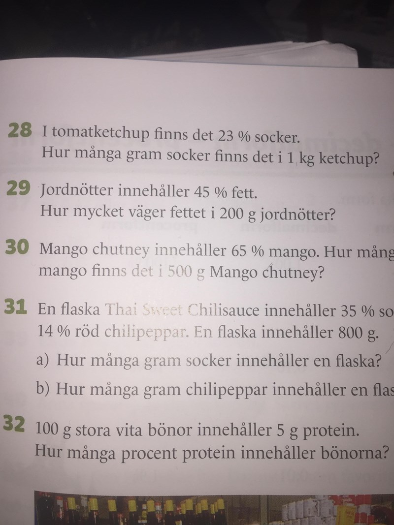 Behöver hjälp med uppgift 28. Jag förstår inte ifall man ska ska omvandla 23% till gram på något sätt, jag har väldigt svårt för att tänka just nu.Tack för hjälpen i förväg.