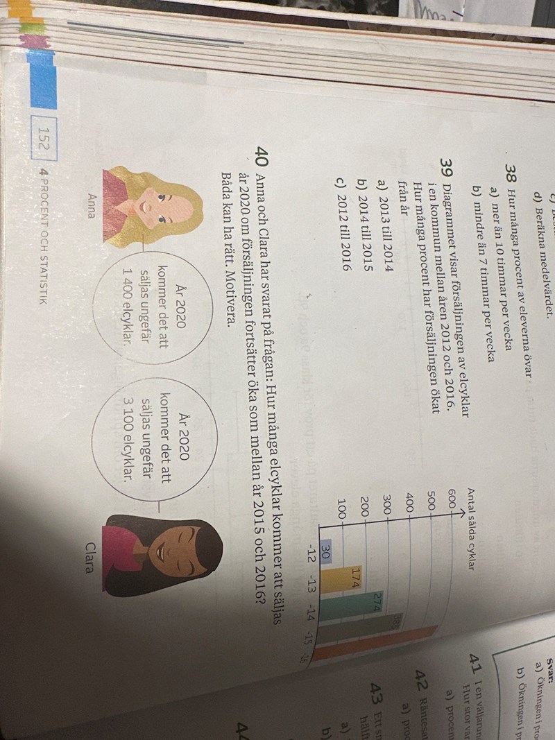 40 facit säger att båda har rätt Anna har rätt med cyklarna om förankring fortsätter som nu och Clara har rätt och procent ökningen fortsätter men hur fattar inte facit