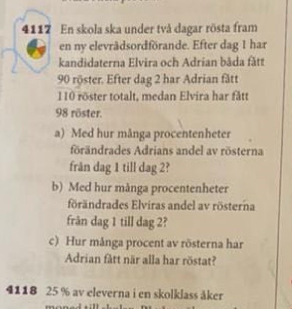 därför följer jag formeln D/H•A där jag vill räkna ut andelen så jag delar Adrians röster på det hela som är 200/388 = 0,515 som kan avrundad till 52% och inte 53 % vad har jag gjort fel SNÄLLA HJÄLP !!