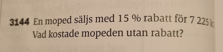 Lat fraga dar. Men jag kan val anda hjalpa till. Om x=pris och x*0.85 (=100 % - 15 %) = 7225, kan du anvanda ett steg av algebra for att losa problemet? Sag, dela x*0.85 och 7225 med samma sak for att fa fram vad x ar?