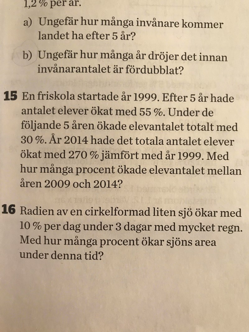 Hej jag behöver hjälp med fråga 15. Först så undrar jag om det är procentenheterna som jag behöver räkna ut. Sedan så undrar jag vilken metod det är som ska användas.