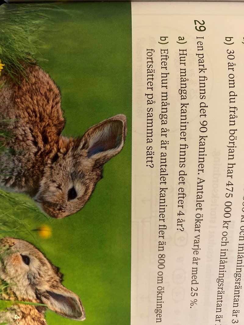Om du har fått fram formeln i uppgift a, så får Du prova dig fram tills du når 800. Jag testade med 10 år och fick då direkt 838 kaniner.