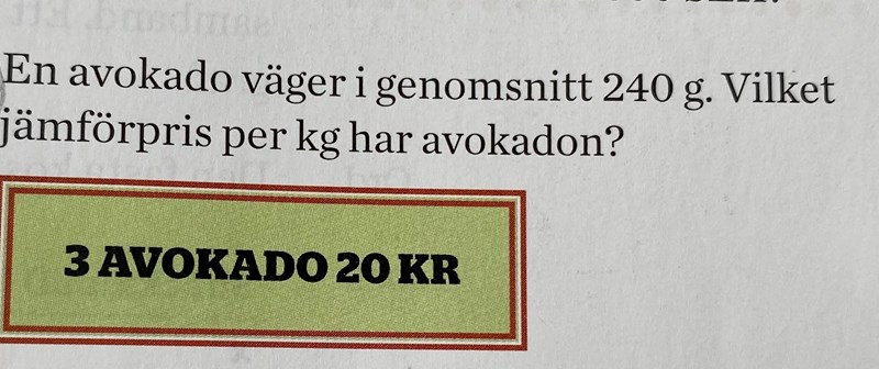 Smaragdalena skrev:3 avocados (avocadoer?) har massan 3*240 = 720 g och kostar 20 kr. JÀmförpriset blir 20/0,720 = 27,777... som avrundas till 28 kr/kg.