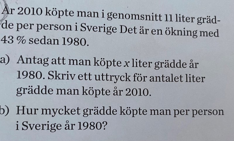 Detta kanske inte är så relevant för att räkna ut svaret på frågan men är allmänt nyfiken. Om frågan skulle vara räkna ut hur mycket grädde man köpte per person 1980, hur hade jag behövt göra då? Blir det 11• 0,57?