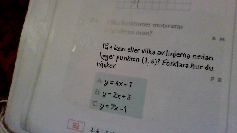 Eftersom att koordinater är alltid (x, y) det vill säga 1,5 i detta fall, så testar man att byta ut variabelna (y=4x+1) med koordinaterna. Om vi tar den första, y = 4x + 1, och man ska byta ut det med koordinaterna för att se om det stämmer. Så blir det 5 = 4 * 1 + 1 vilket blir 5 och funktion A stämmer då