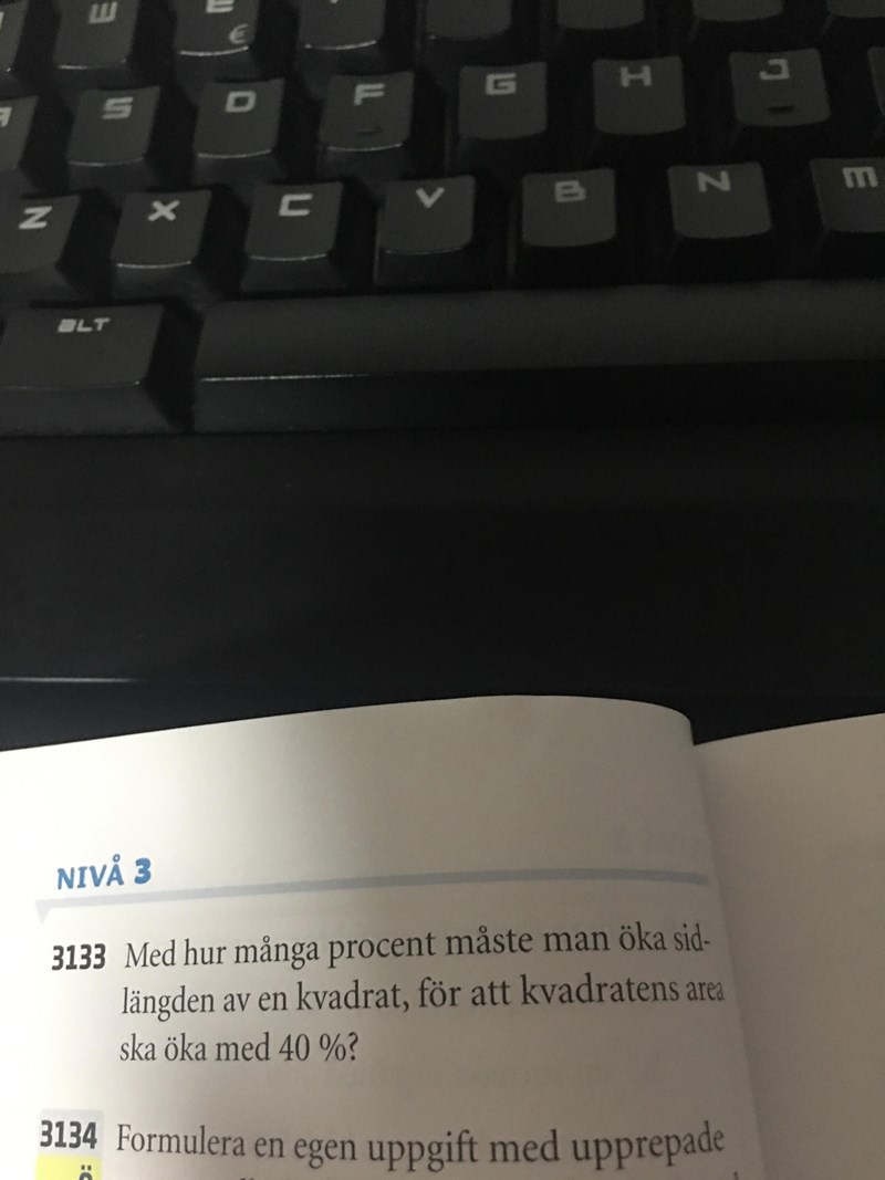 Ifall du nu multiplicerar den med någon förändringsfaktor låt os säga a måste arean öka 40%. ifall en sida är ax kommer arean vara =1,4 alltså