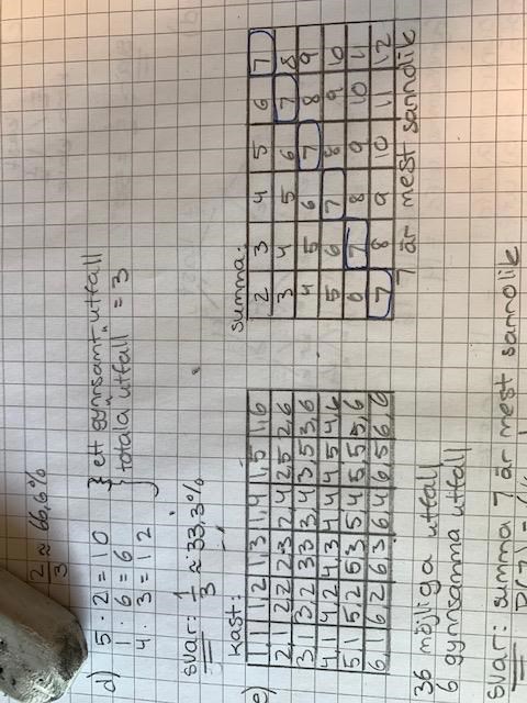 Frågan innan löd på samma sätt fast med två tärningar och då gjorde jag såhär: I vänster "tabell" är vilka utfall man kan få och i höger är summan.