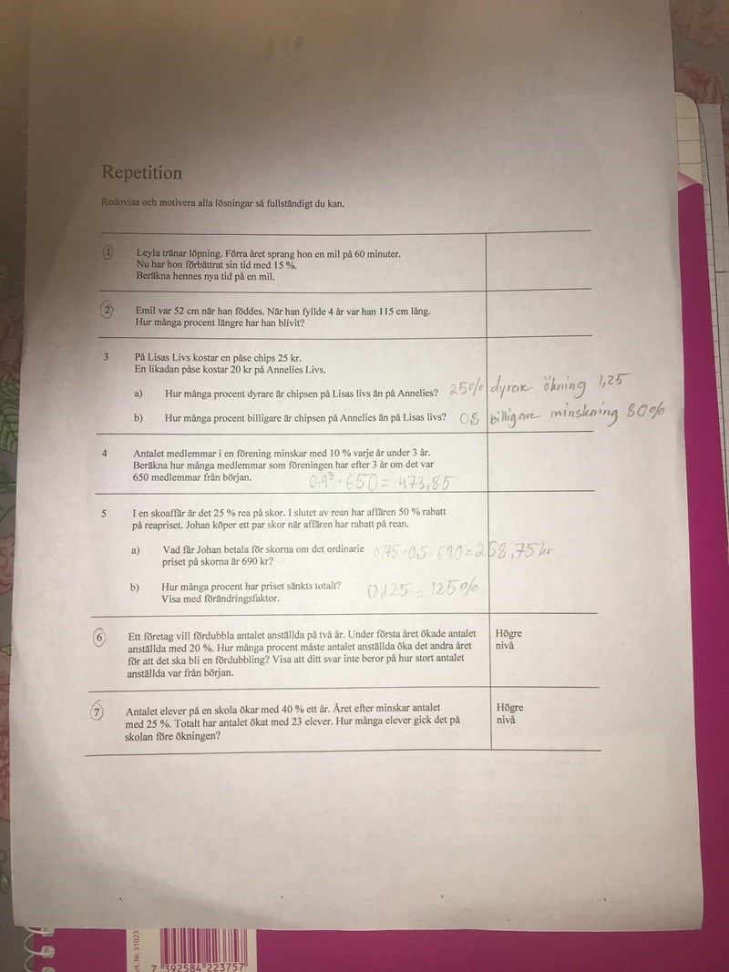 Vi kan säga att det går X elever från början på skolan. En ökning av 40% motsvarar en förändringsfaktor på 1.4 och en minskning med 25% motsvarar 0.75.