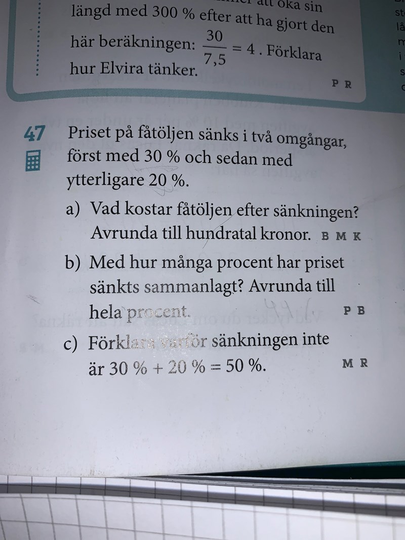 Hej, jag behöver hjälp med fråga b och a. Jag vet inte hur man beräknar med hur många procent ett pris har sänkts sammanlagt. Skulle någon kunna hjälpa till? Alltså inte säga svaret utan att förklara för mig hur man räknar ut det.