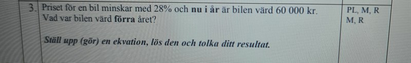 Bilen minskar i värden med 28%. Alltså är bilen värd (100-28)%=72% av bilens ursprungliga värde året efter. Detta kan skriva 0.72x