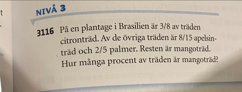3/8 = 9/24 är citroner. 1/3 = 8/24 är apelsiner. 1/4 = 6/24 är palmer.