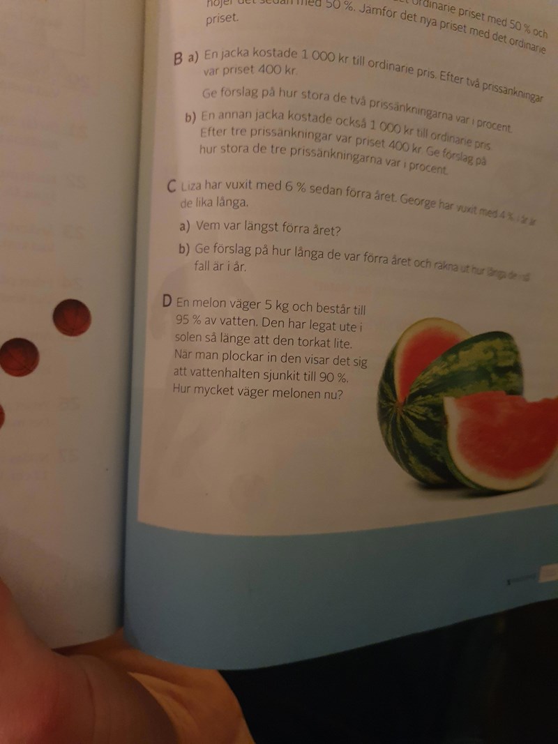 Jag hjälpte min brorsa som går i sjuan med en uppgift som det inte finns något facit till och fick svaret 4,75 kg. Det konstiga är att hans lärare fått ett svar på 2,5 kg. Jag måste bara veta om jag har tänkt totalt fel och om det krävs kan jag lägga ut min beräkning. (Det är uppgift d jag syftar på)