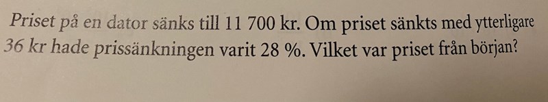 Så ett pris sänks med 28% och det nya priset blir 11664 kr. Vilket var priset från början?