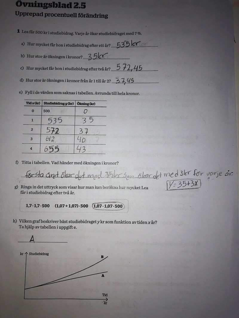 På fråga d har du räknat ut något annat än man frågar efter (du har räknat ut ökningen från år 0 till år 2, inte från år 1 till år 2). Du har gjort samma fel i tabellen p åe också. Du behöver rätta till det innan du kan lösa uppgift f.Du har inte ringat in rätt uttryck på uppgift g.