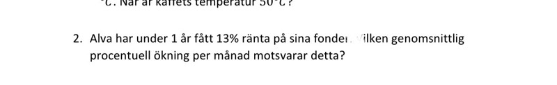Okej så om jag har förstått rätt som början man med att göra om 13% till förändringsfaktor. Sen så ställer man upp en ekvation vilket i detta fallet var x^12 som stod för procenten och 12 som stod för månaderna eftersom x förhöjs 12 gånger under ett år. Sen så för att simplifiera uträkningen tar man förändringsfaktor upphöjt med 1/12. För att få ut X?