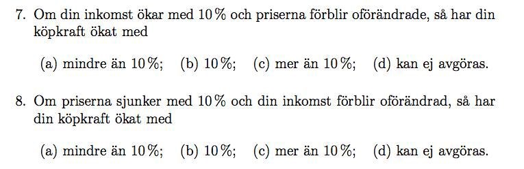 Bå uppgift 8 tycker jag att det är enklare att tänka sig att priserna sjunker med 50 %. Om allting kostar hälften så mycket, kan du då köpa mer eller mindre än 50 % mer för dina pengar?