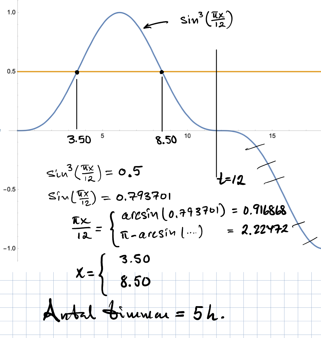 Under en molnfri dag med 12 timmars solljus, kan intensiteten 𝐼 hos solljuset approximeras med 𝐼 = I0s𝑖n3(𝜋𝑥/12) där I0 är maximal intensitet och 𝑥 är tiden i timmar efter solens uppgång.