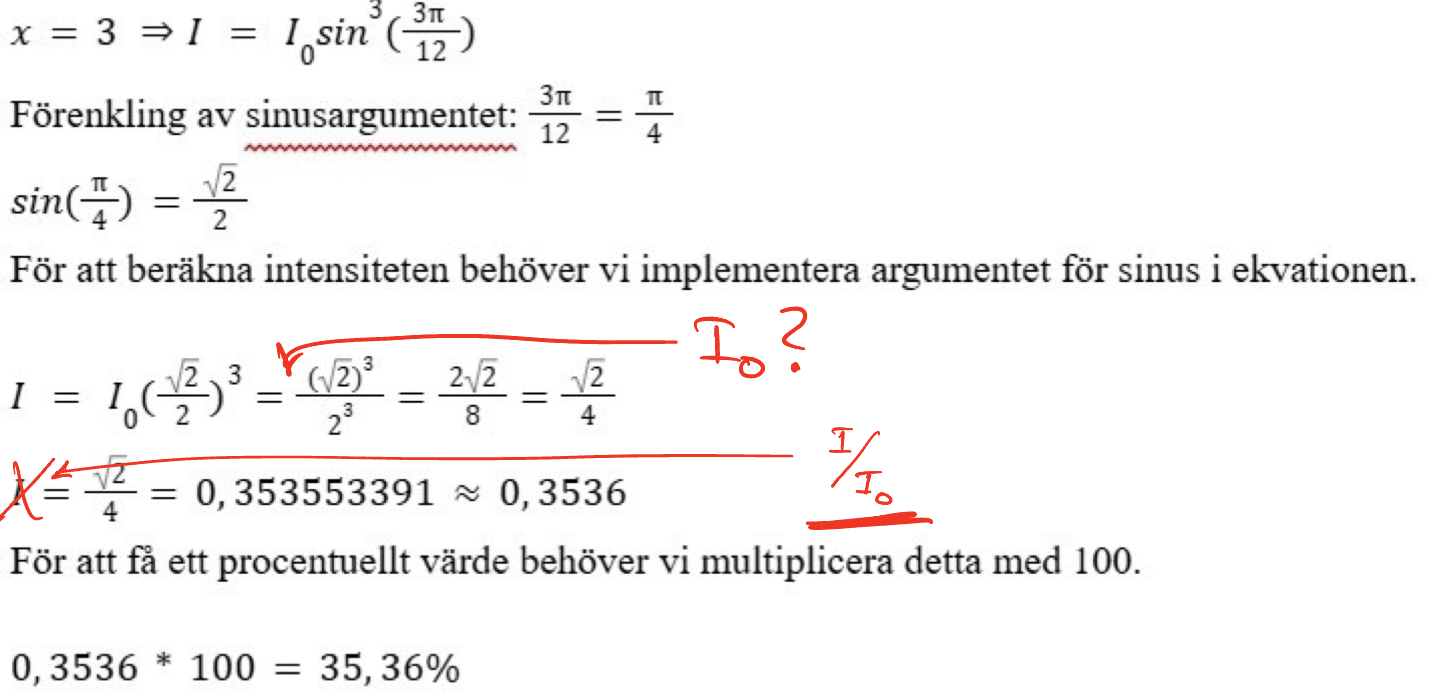 - a) Bestäm hur många procent av maximal intensitet som solljuset har 3 timmar efter solens uppgång.