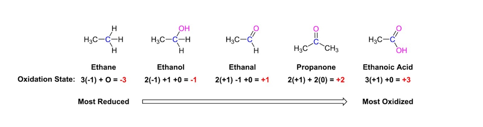Här kommer en fråga tillbaka: Är du van med de olika oxidationsgrader av kol från alkaner till koldioxid +4?