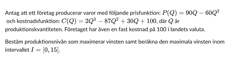 När du har ställt upp vinstfunktionen (glöm inte -100 som är företagets fasta kostnad) bestämmer du den optimala produktionsnivån (antar att det är samma som produktionskvantiteten) Q genom att derivera m.a.p. Q och likställa med 0. Titta därefter på andraderivatan för att försäkra dig om att det faktiskt är ett maximum.
