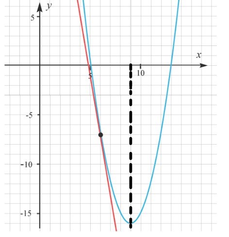 Den ligger skär mitten av kurvan:Och formler är (nollställ1+nollställ2)/2 dvs.  (5+13)/2=9