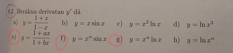 g) är också rätt men inte särskilt praktisk form på svaret. I båda termerna har du x^(n–1), men du väljer att bryta ut x^n och får x^(–1) inne i parentesen. Svar ska ges på “enklaste form”. Vilken det är kan variera från situation till situation, men ditt är nog sällan enklast.