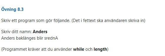 Behöver hjälp med denna uppgift. Jag har försökt lite grann, antar att jag måste göra en string av namnet. Men sen vet jag inte hur jag ska fortsätta...försökte lite med att öka positionen, men vet inte om det stämmer. Måste jag skapa en ny variabel för att kunna bestämma namnet baklänges? Tacksam för hjälp!