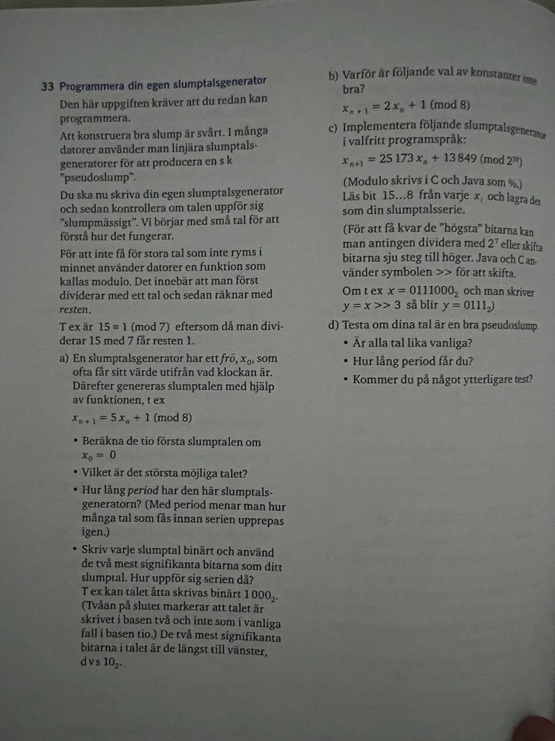 Hej, jag ska programmera min egna slumptalsgenerator och med hjälp av den så ska man lösa ut uppgift 33 på sida 252 i boken(matte 5000 5). Jag har skrivit upp en kod som slumpmässigt ger mig olika siffror men jag vet inte hur jag ska göra på uppgift 33 och hur det har ett samband med slumptalsgeneratorn alls... jag är helt ute och cyklar och behöver hjälp, tack!