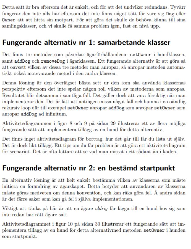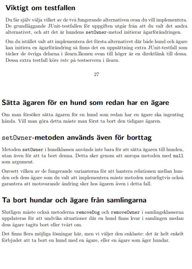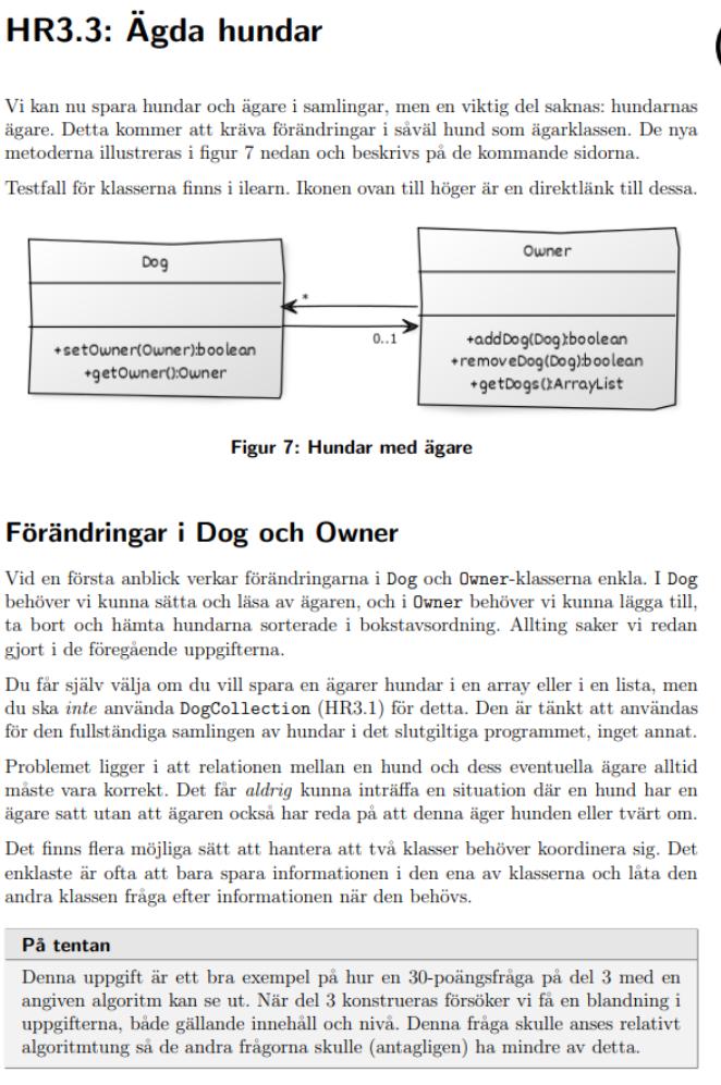 Hej tänkte kika ifall det finns nån här som kan hjälpa mig då vi har rätt så fullt på handledningen nu innan tentaperiod. Det är så att vi håller på att skapa ett Hundregister i Java programmering 1. Jag bifogar bilder instruktionerna för registret nedan. Jag har nämligen fastnat på uppgift 3.3 (läs uppgift 3.3 i bifogade bilder längst ner) och sitter fast med 10 Failures, och tänkte kika ifall nån har några tips på vad jag missat att göra. Jag tror felet kan ligga i min CollectsOwner kod i och med att mina failures klagar på att min Owner klass inte är rätt implementerad. Utdrag ifrån instruktionerna: "Ta bort hundar och ägare från samlingarna