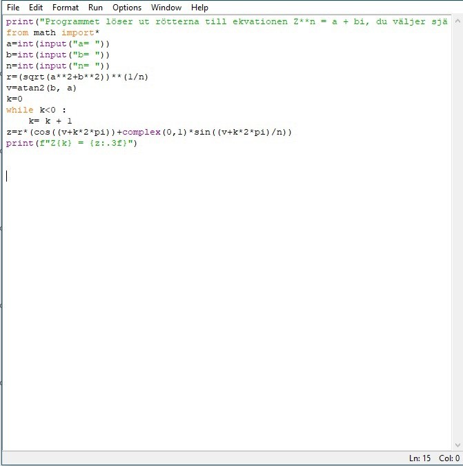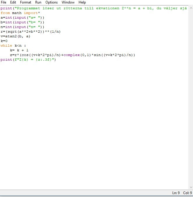 Jag ska skapa ett program som löser ekvationen z^n=a+bi där a och b är realla tal och n är ett positivt heltal. Jag kan använda funktioner från math-modulen.