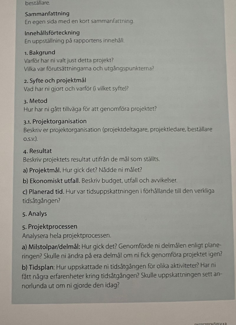 Hej, jag ska skriva en projektrapport och har lite problem.. om ni kollar på bilderna så ser ni att nummer 5 står fyra gånger. Ska jag då besvara alla dessa punkter under fem eller har det blivit något fel i boken? Tycker det är lite konstigt.. den första femman handlar ju om att ”analysera” men sen står det inget mer, medan nästa också är analysera fast projektprocessen. Snälla hjälp är väldigt förvirrad, vilka punkter är fel