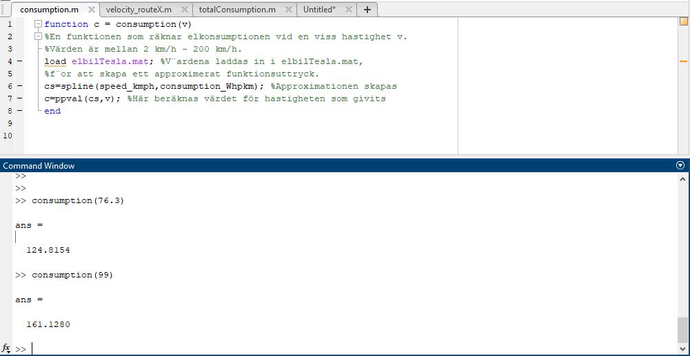 Edit: Jag anropar funktionen genom att först ladda ElbilTesla filen och sedan anropa genom tex: consumption(87.2) Jag fick: