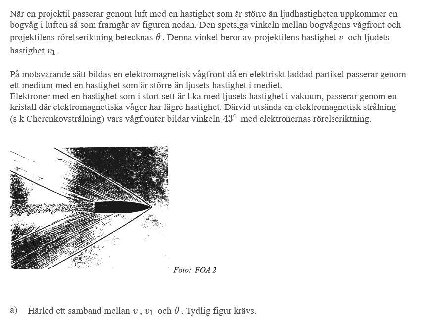V:s riktning, och vinkeln mellan projektilen och V förstår jag. Det jag inte förstår är varför v1 (ljudets hastighet) är riktad på detta sätt och hur den ens från första början kan påverka vågens vinkel.