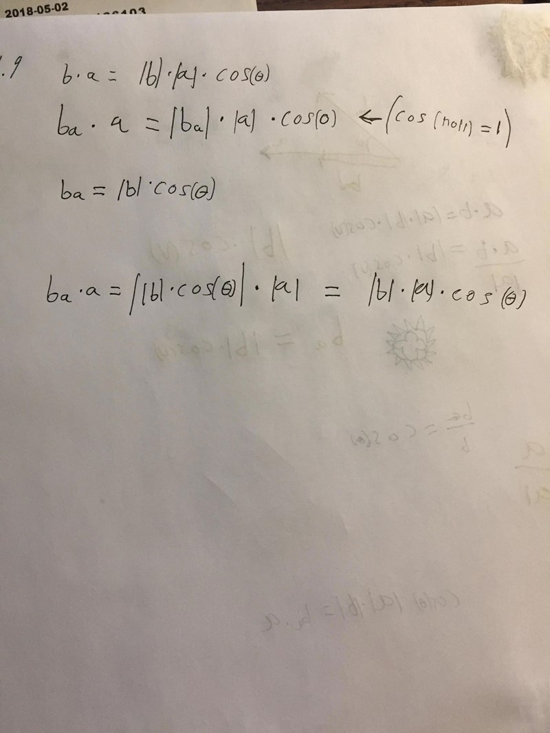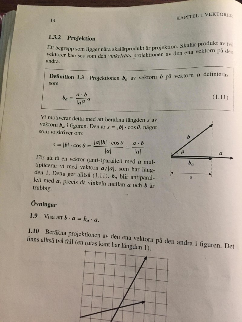 en projektion görs av en vektor på en annan vektor, projektionen kan ses som en skugga av b på a om solen skiner över b. man får ut en skalär och multiplicerar det med enhetsvektorn för a.