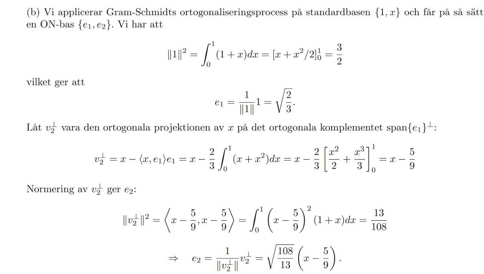 fråga 1: Till enbörjad hade jag svårt ta förstå varför det skulle vara så. MEN jag tänker att om den första basvektor har normen 1. Jag tänker att vi inte kan välja "samma" vektor igen för då är det inte längre en bas.