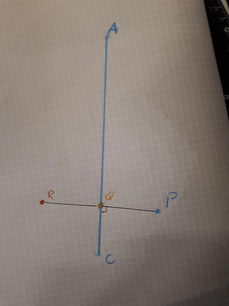 Här är Q projektionen av P på linjen AC medan R är reflektionen av punkten P i linjen AC. Precis som matsC säger är den normal från linjen AC som innehåller P viktig för konstruktion av både reflektion och projektion. Notera också att man av symmetriskäl får lika vinklar ACP och ACR och att Q ligger mitt på linjen PR.