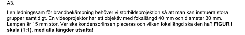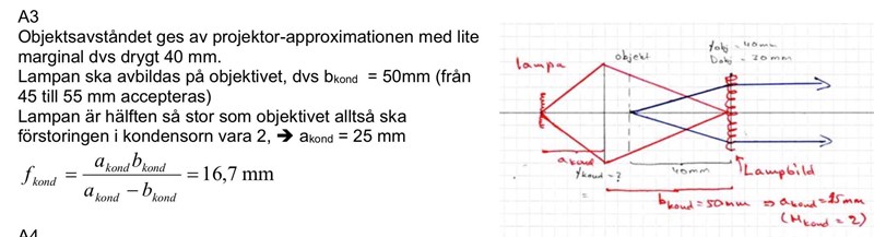 Jag vet att med projektorapproximation kan man sätta att a(objektiv) = f(objektiv), men hur får jag fram att b(kond)=50mm?