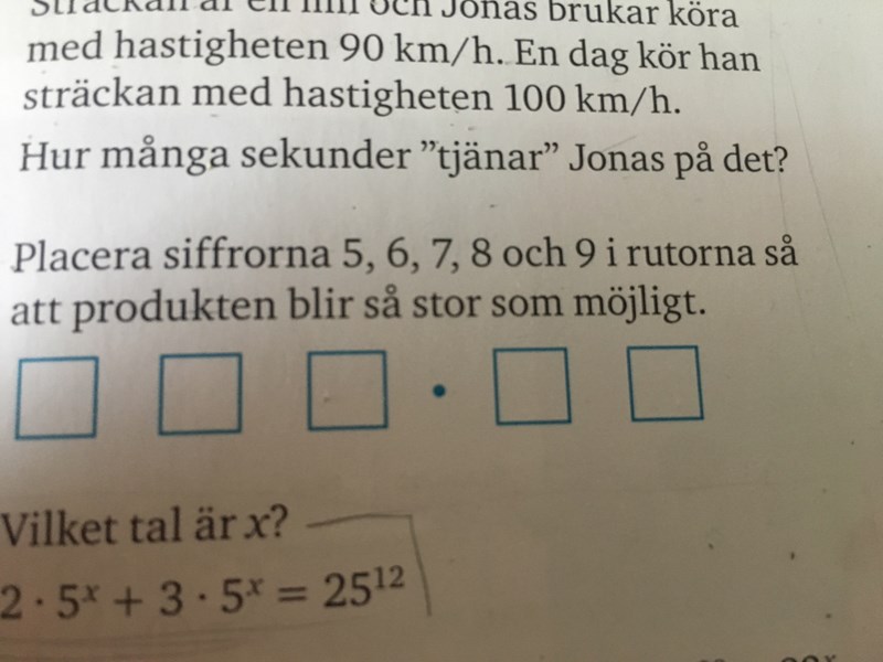 Placera siffrorna 5, 6, 7, 8 och 9  i rutorna så att produkten blir så stor som möjligt.