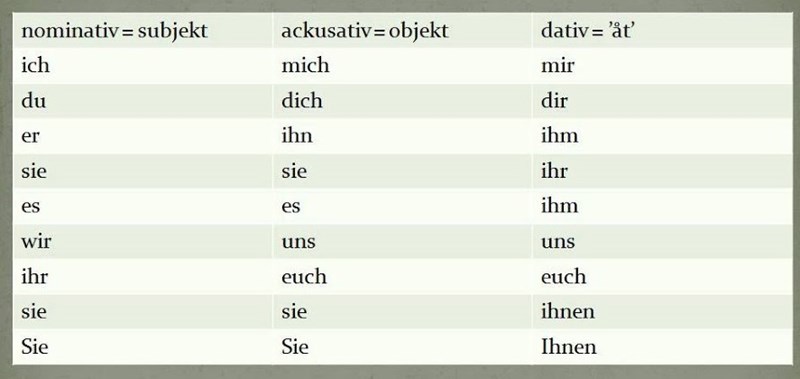 ex. Der Lehrer gibt mir einen Apfel"(Läraren ger mig ett äpple). Ich zeige ihm das Zimmer (jag visar honom rummet), Das Kino emphelt uns einen guten Film (Bion rekommenderar oss en bra film)