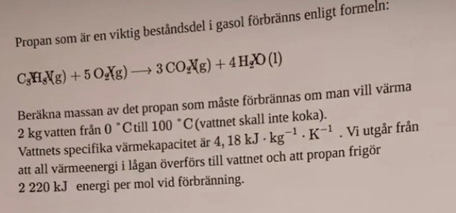 Ja, nu har du räknat ut att det går åt 0,377 mol propan för att värma vattnet. Vilken massa har 0,377 mol propan?