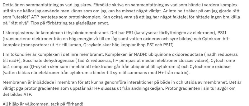 mag1 skrev:Svaret på denna fråga kan vara både övergripande och detaljerat. Så det går inte att ge relevant återkoppling utan att veta hur detaljerat du försöker besvara frågan. Dessutom om vi lämnar återkoppling på en sammanfattning av en längre text finns en risk för att vi anstränger oss i onödan - du kan t.o.m. redan ha skrivit men inte visat de delar vi kommenterar på.