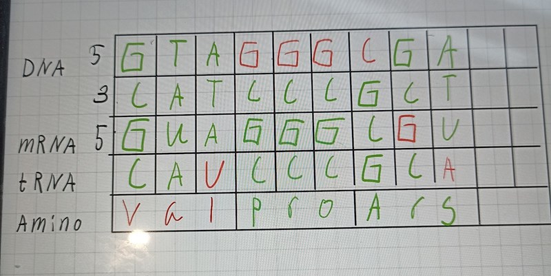 Och slutligen så har du använt både sekvensen i mRNA och antikodonsekvensen (tRNA sekvensen) för att översätta till aminosyra, vilket ju inte går - du kan bara använda den ena eller den andra. Oftast är det mRNA sekvensen som finns i tabellen (men det vet endast du, som har din tabell).