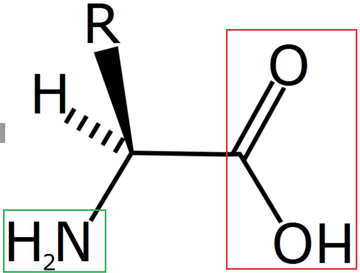 Aminosyrorna berstår av en aminogrupp (grön) samt en karboxyl(syra)grupp (röd), vilket ger dem namnet.