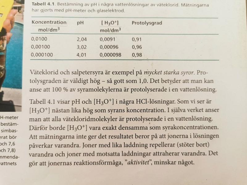Jag fattar inte varför väteklorid har en högre protolysgrad när det finns en mindre koncentration av den och är det inte så att protolysgrad måste anges i procent?Kan man ens säga att reaktionen mellan vatten och väteklorid är reversibel när väteklorid har så här hög protolysgrad vilket innebär att reaktionen är mycket förskjuten åt höger?