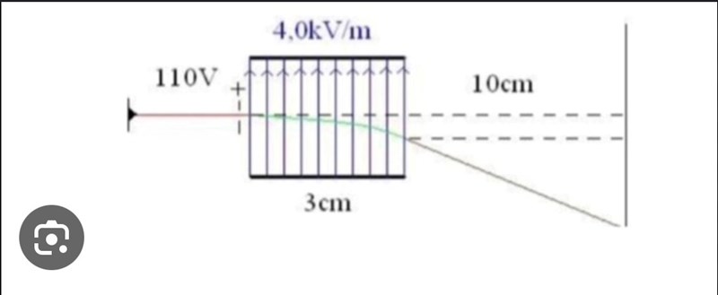 En proton accelereras med spänningen 110 V och passerar därefter genom ett elektriskt fält med fältstyrkan 4,0 kV/m enligt bilden nedan. Fältets längd är 3,0 cm. Bortse från gravitationella krafter i uppgiften. Hur stor sträcka har protonen avlänkats då den lämnar fältet?