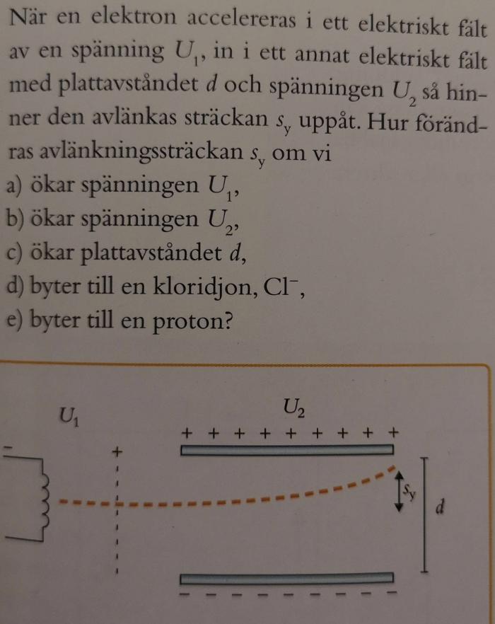 Jag fattar inte e) riktigt, vad menas med att en proton inte kan accelereras av U1? Menar de typ att spänning överlag bara accelererar elektroner. Eller är det hur U1 är riktad, alltså med negativ pol vänster och positiv åt höger, så att protonen vill hållas vänster.