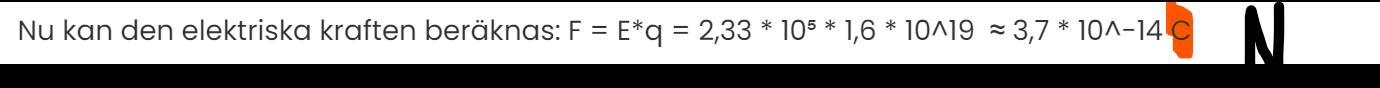 Nu kan den elektriska kraften beräknas: F = E*q = 2,33 * 10⁵ * 1,6 * 10^19  ≈ 3,7 * 10^-14 C